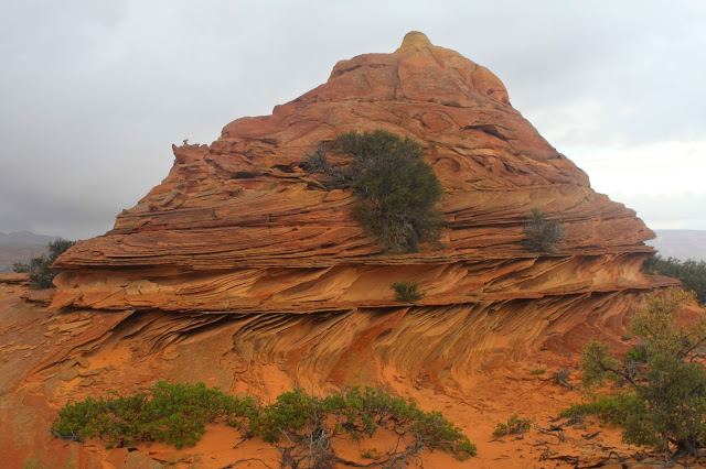 We woke early Saturday morning, hopeful our trip to South Coyote Buttes in the Vermillion Cliffs National Monument would be a "GO." There had been a few sprinkles overnight, and a little wind, but nothing severe. Of course, up on the buttes could be an entirely different situation. So we were quite happy when our hosts Susan and Steve informed us over a breakfast that we were going to go for it! Susan made delicious sack lunches for us and our fellow adventurers; Connie, Brenda and Roger, and we piled into Steve's large 4WD. After a short drive on the highway, we bid goodbye to pavement and headed into the hills on an increasingly challenging road, with Steve pointing out the low spots where we would be unable to cross in case of flash flood. After miles of bouncing, we left the relative civility of that road and followed a track deeper into the hills---basically a pair of ruts through the sand, through muddy slogs, and over some gnarly rock ledges. All of us were increasingly impressed with Steve's prowess in piloting his beast over the obstacles. We finally arrived at the end of the track and marched uphill. For about 4 hours, Steve led a winding path up, over and through the formations, with each turn eliciting a chorus of exclamations from all of us. We enjoyed the company of our fellow travelers and the little rain we experienced didn't dampen anyone's enthusiasm. Steve stayed in contact with his wife and partner Susan who watched the weather radar back home. We were able to make a full day of it and to drive out the same route we came in.